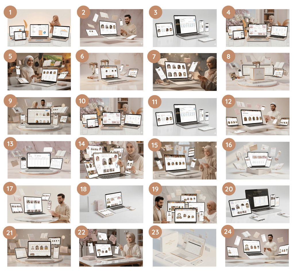 A: You’ll get 24 ready-to-use productivity systems designed for Muslims covering Salah, Quran, dhikr, sadaqah, habit tracking, project management, budgeting, personal growth, and more. Each template is built to help you align your deen and dunya with clarity and consistency.