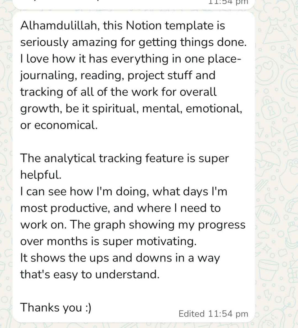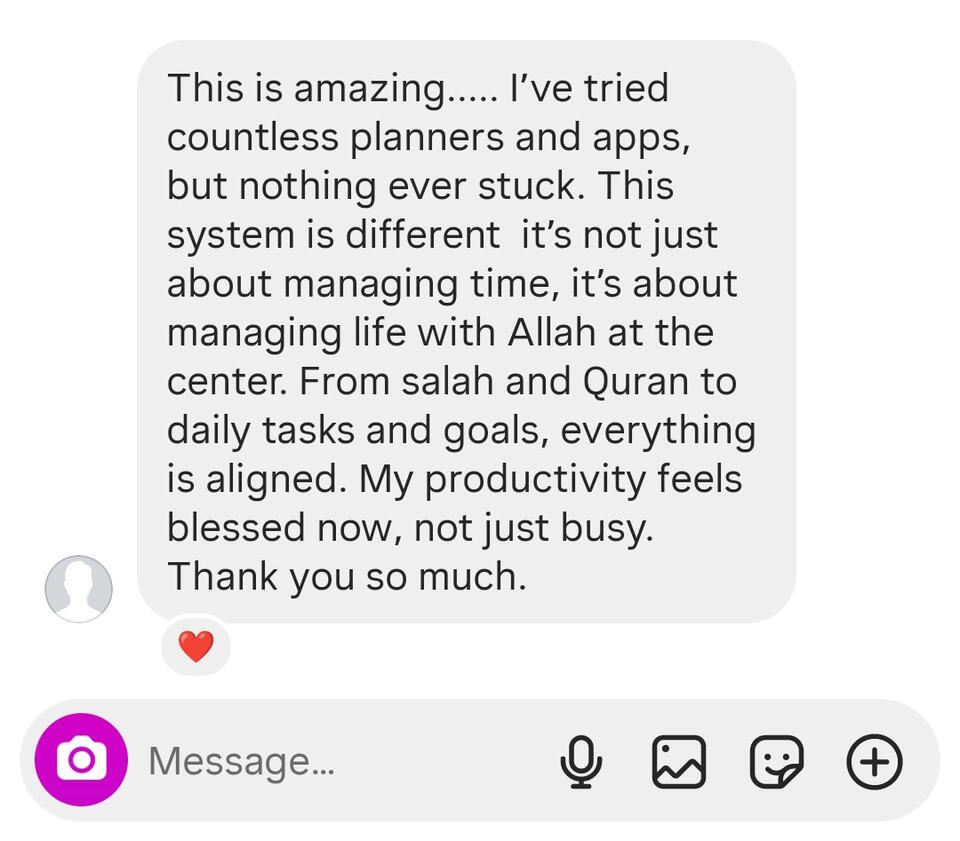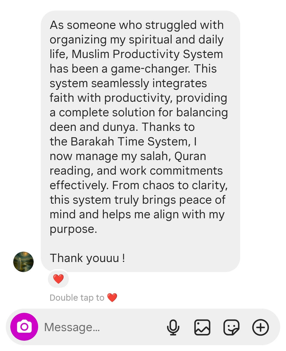 Muslim Productivity System is a professional digital productivity platform designed especially for Muslims who want to balance Deen and Dunya. Our mission is simple: to provide reliable, faith-centered productivity tools that make it easier to stay consistent in worship, manage daily tasks, and grow personally and spiritually.We are committed to creating systems that don’t just organize your time they bring barakah into it. Every template is built with passion, precision, and purpose, so you can live a life that aligns with your ultimate goal: getting closer to Allah ﷻ.This is more than just productivity. It’s about building a lifestyle where your Salah, Quran, dhikr, learning, and dunya responsibilities all flow together with clarity and peace.Your love and support mean everything. In shaa Allah, we’ll continue to create and share valuable resources that benefit you in both this world and the Hereafter.